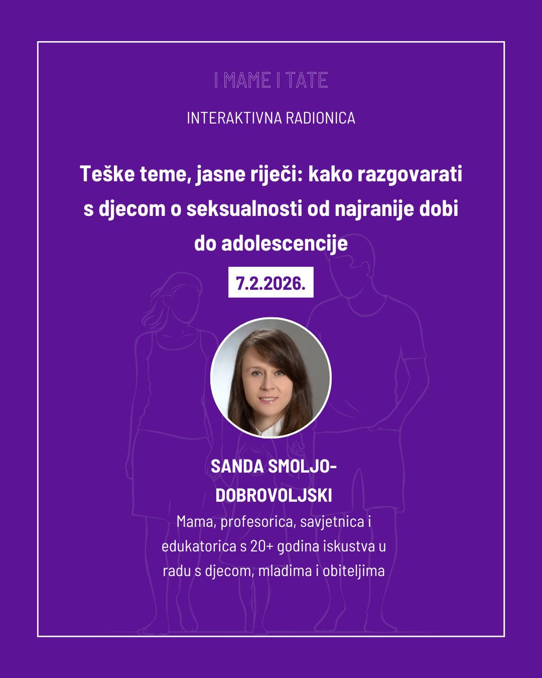 Seksualni razvoj djece i adolescenata svakodnevna je, a često i osjetljiva tema u obitelji: pitanja o tijelu, dodirima, privatnosti, golotinji, znatiželji, “dječjim igrama”, jeziku koji djeca koriste, sadržajima kojima su izložena te odnosima i zaljubljivanjima. Mnogi roditelji osjećaju nelagodu, nesigurnost ili strah da će “reći nešto pogrešno”, dok istovremeno žele djetetu biti sigurna osoba i postaviti jasne, zdrave granice.